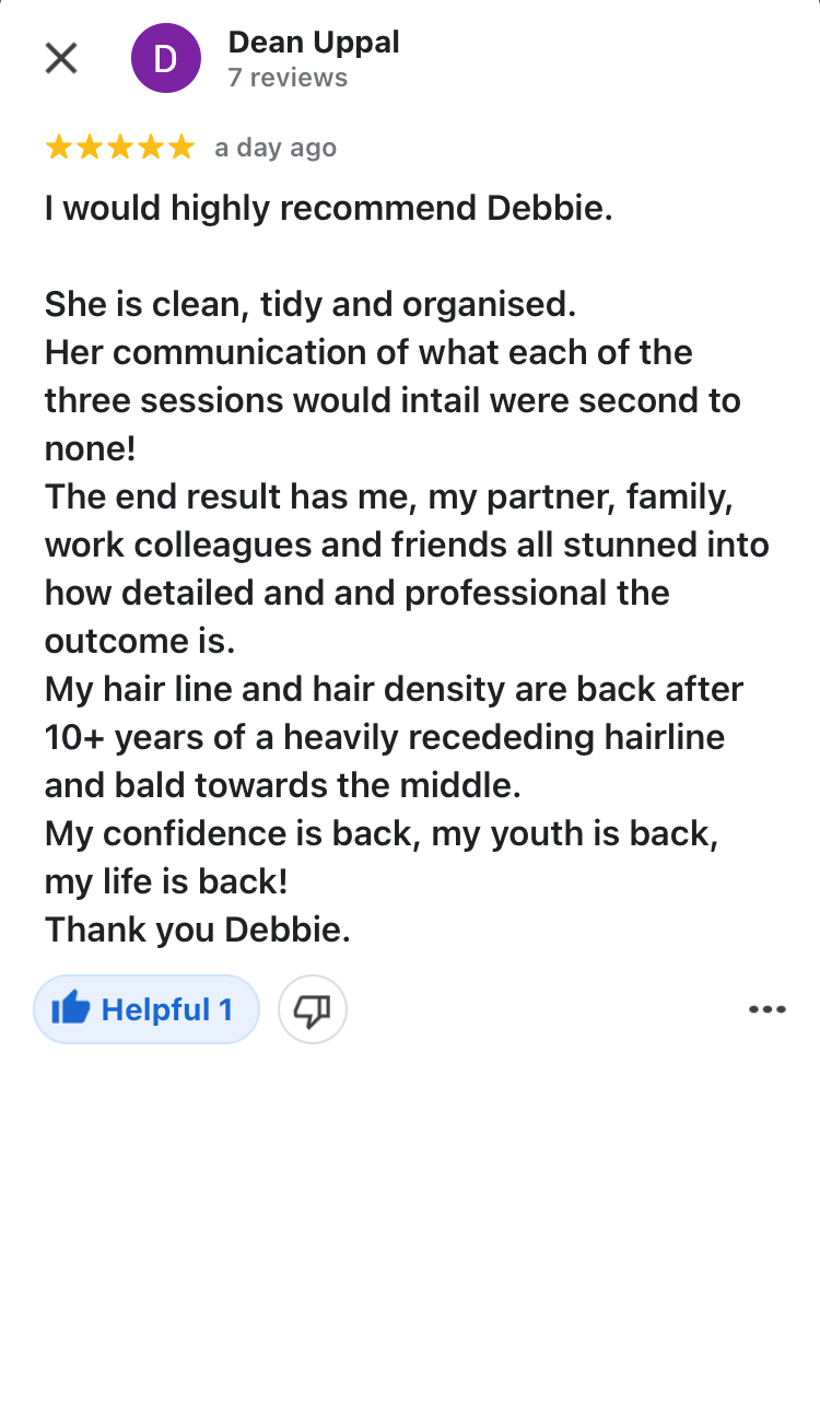 I suffered from male pattern baldness from the age of 28. As a performer I struggled to come to terms with my hair loss. I spent years wearing hats . I read about scalp micro pigmentation. It seemed like the perfect affordable treatment. I went for a consultation and decided to undergo the treatment. It was completed in separate sessions and was painless. I was consulted throughout and completely delighted with the finished result. My hair looks completely authentic and has totally restored my confidence. I would recommend this treatment as it has changed my life.